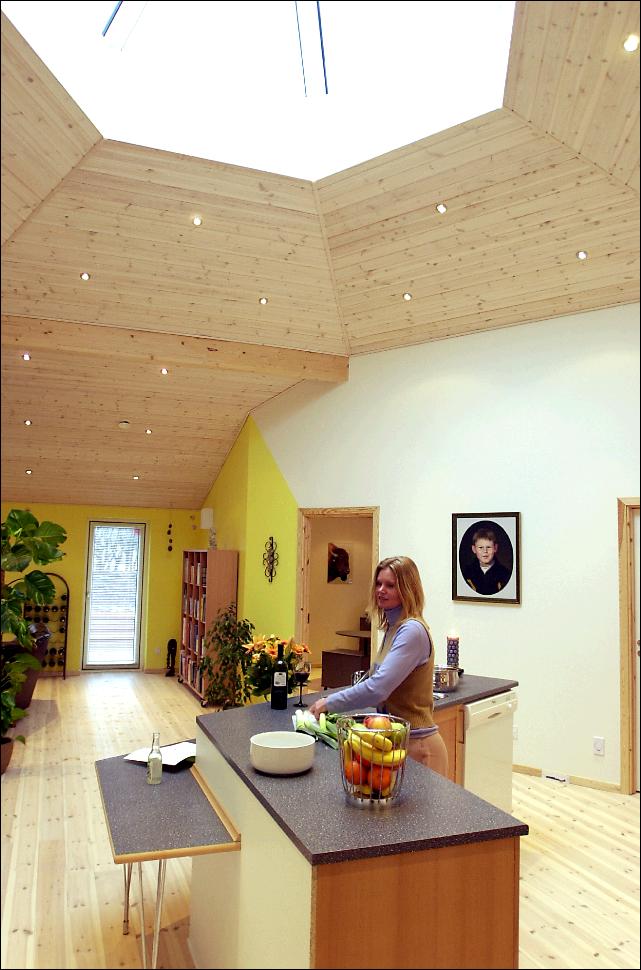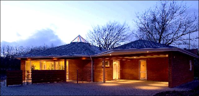 Om sommeren bruges anlægget modsat som aircondition, og køler huset ned. Hele energianlægget styres naturligvis helt automatisk, og sikrer altid den ønskede temperatur inde i huset. Alt dette betyder, at den årlige udgift til opvarmning kun ligger på 3.000-3.500 kroner! Et vandvex-anlæg sørger for det varme vand til kun ca. en tredjedel af normalprisen. Et centralt støvsugeranlæg gør sammen med genvex-anlægget og et omhyggeligt materialevalg boligen sund og behagelig også for allergikere. Alt i installationer Godt 2,5 km ledninger og kabler sørger for, at alle opholdsrum har bl.a. internetadgang, fasttelefonforbindelse samt TV- og radioantenne. Der er indbyggede højtalere overalt i huset. Både ud- og indvendig oplyses huset af 120 halogenlamper med lysdæmpning, hvilket skaber en ganske speciel "varm" stemning. Meget for pengene Ét er selve byggeriets kvaliteter, et andet er beliggenheden, og også her er der tale om noget ganske særligt. Huset ligger på en skøn naturgrund med skov og mark som naboer. Mange træer og buske med bær gør området til et eldorado for fugle - heriblandt også mere sjældne som fuglekonger og dompapper. Prisen for hele herligheden ligger på godt to millioner kroner. Men de lave energiomkostninger betyder, at boligudgiften ikke er større end i et mindre, nybygget hus af mere traditionel karakter. Dette får Tommy Mortensgård imidlertid ikke selv megen glæde af, for grundet jobskifte har han valgt at sætte huset til salg. |