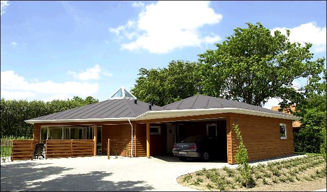 Artikel fra bladet "Folk og Finans". Utraditionelt hus med indbyggede energibesparelser Det er sekskantet, og det er beklædt med sibirsk lærketræ - det nyopførte hus på Møllesvinget 18 i Andrup ved Esbjerg. Hvad man ikke umiddelbart kan se er, at der er tale om et lavenergihus, baseret på en god portion teknologisk nytænkning. Bl.a. har Danmarks Tekniske Universitet (DTU) kontaktet bygherren, for at få lov til at været med på sidelinjen med avanceret måleudstyr. Husets bygherre er Tommy Nøddebo Mortensgård, der selv har tegnet det 190 kvadratmeter store, utraditionelle hus. Ideen med den sekskantede grundplan skyldes, at pladsen dermed udnyttes optimalt, og at alle husets rum kommer til at ligge lige centralt i boligen. Effektiv energiudnyttelse Huset er naturligvis effektivt isoleret, og et genvex-anlæg henter og returnerer energi fra husets varme udblæsningsluft. I kolde perioder suges indblæsningsluften, ude fra naturen, gennem 100 m rør nedgravet i en jorddybde på 180 cm. Derved varmes den kolde vinterluft på fx. minus 5 grader altid op til ca. plus 8 grader, inden den hentes ind i genvex-anlægget.